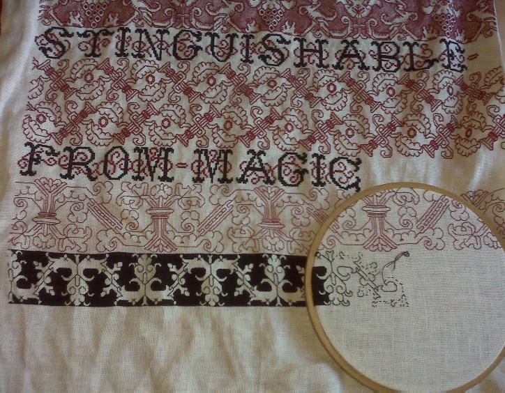 Next will be a very wide strip, probably worked two tone using both the red and the black together. Slightly less dark than the narrow strip I’m working now, but denser than the motto bearing areas above it, to help anchor the bottom. I’ve got a couple of candidates but haven’t decided exactly which one to do. After that it’s probably between one and three strips to finish out the cloth, depending on width of the patterns chosen, filling in the area east of “Magic” with an author attribution in a smaller font (probably balanced with a narrow strip to take up any remaining space); and doing some end of line doodles to square out the ragged right in the other text strips. Then finishing and framing. Taa daah!