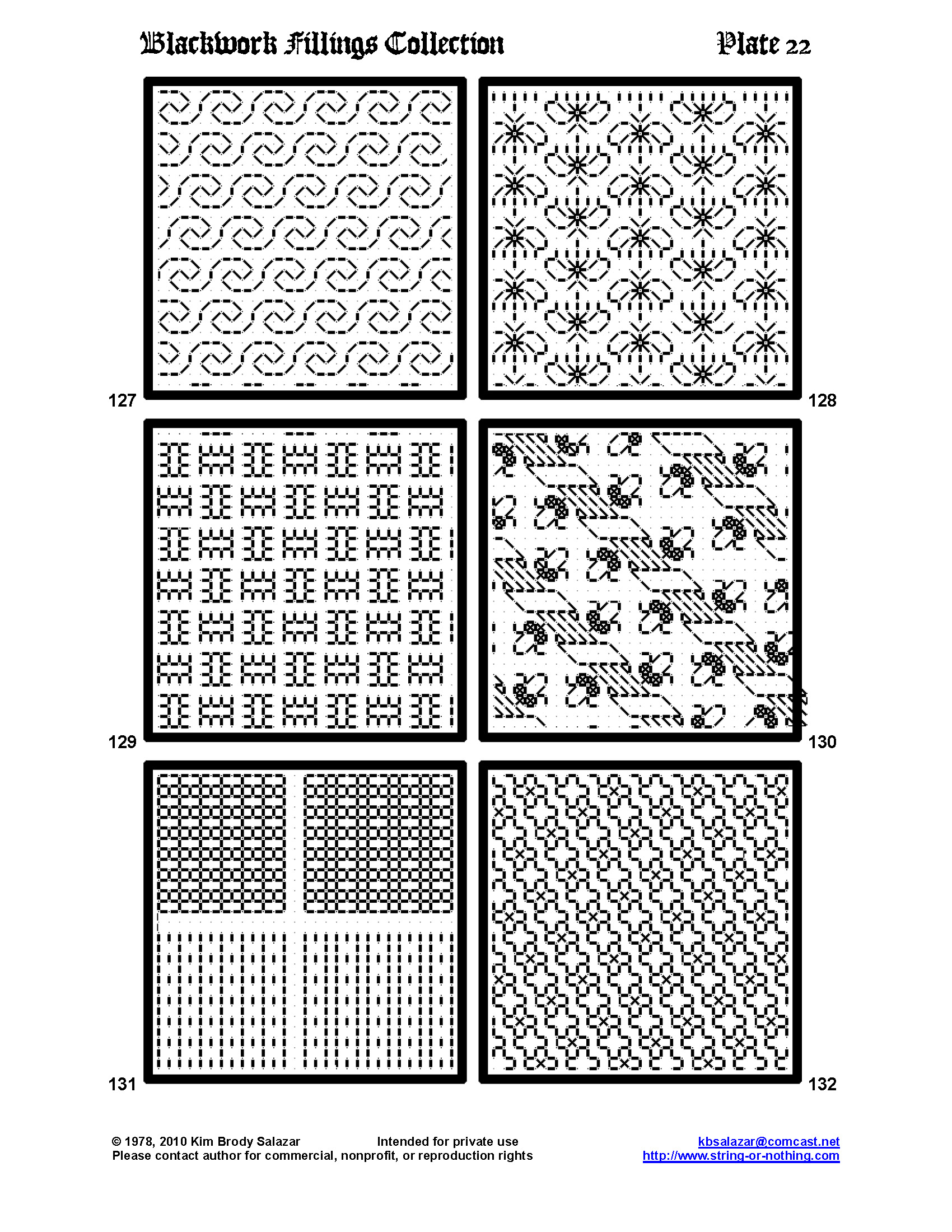 All of the patterns on this page are my own. Two of the smaller fillings in #131 are in my coif. Like my snails which I’ve recently found have crept all the way to Finland, the gnats in #128 were inspired by the period English embroiderers’ love of insects (related thought – look into this worthy cause). I’m also fond of #130, which would be a wonderful all over or strip panel treatment for chemises, perhaps mirrored down the center of the garment.