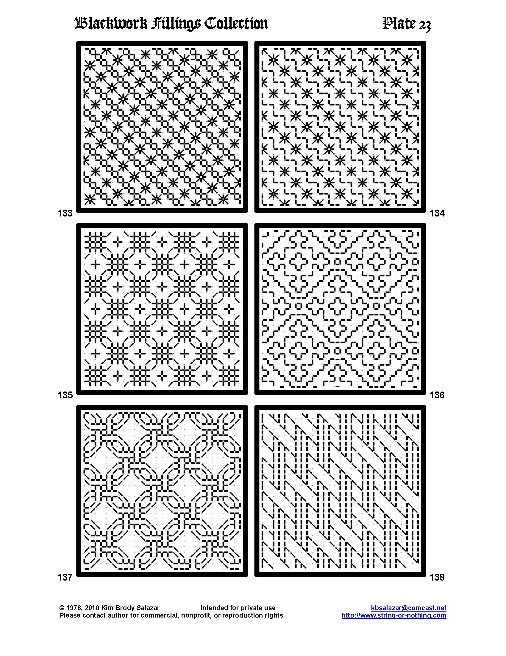 All of these are new doodles, although #137 is a truncation of the framing device I used in my Buttery pattern. #133 and #134 are almost identical. The only difference between them is a second double running stitch line, turning the diagonals between the eyelet stars from steps to little squares. You can never have too many interlaces. #137 and #138 aren’t the last one in the collection, I promise.