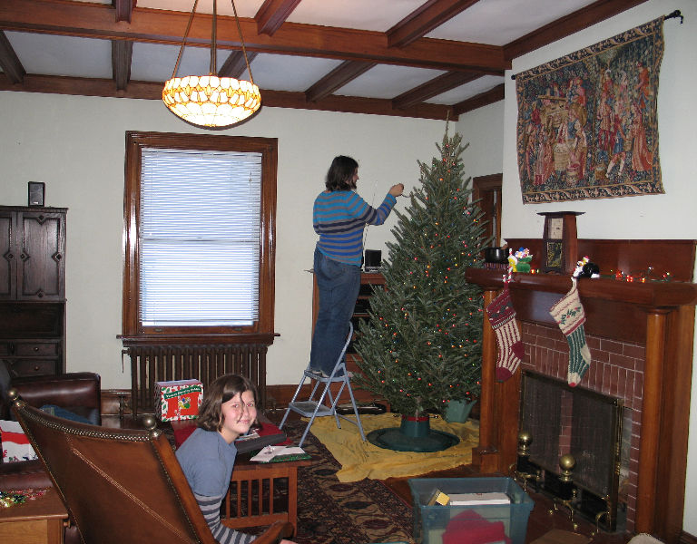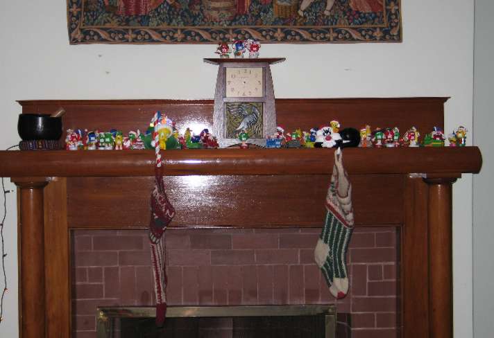 Love the tapestry over your fireplace. Did the daughters knit their own stockings? And how in the world did that pig fit in your stove? (Perspiring Minds Want to Know)