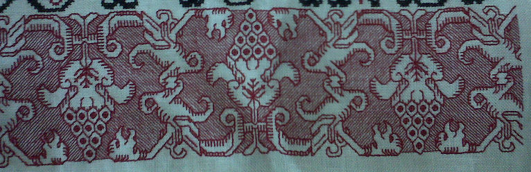 Now some people say that large patterns are harder to stitch than small ones. That patterns like those on my current sampler are difficult. I say they’re not especially harder than small patterns. Accomplishing them is a matter of care and perseverence, but a the size of a large pattern doesn’t automatically make it difficult. To me, three things make a pattern difficult to stitch, the type of repeat, length of unadorned runs over bare ground, and the presence of off-count elements.