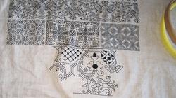 You can see the three fillings from the blackwork filling collection immediately above this new strip. It’s very different in feel from the previous pieces. The proportions are huge. It will span edge to edge (half again as wide as the already-embroidered area, with 25% extra to the right and left of the stitched area. This pattern is one of the ones that will appear in the upcoming book. I’ve charted it from a 16th century artifact in the collection of the Metropolitan Museum of Art in New York.