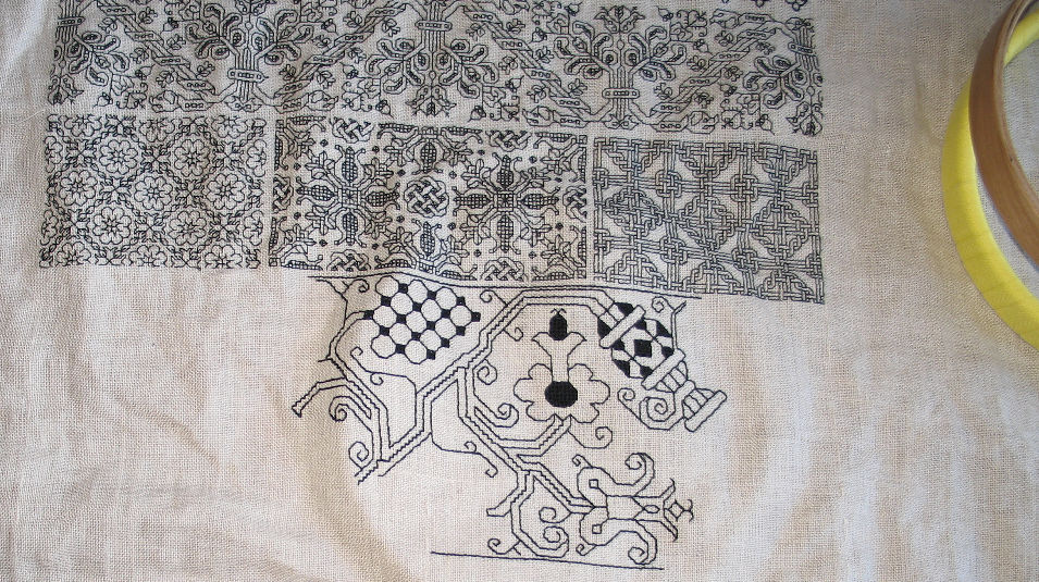 You can see the three fillings from the blackwork filling collection immediately above this new strip. It’s very different in feel from the previous pieces. The proportions are huge. It will span edge to edge (half again as wide as the already-embroidered area, with 25% extra to the right and left of the stitched area. This pattern is one of the ones that will appear in the upcoming book. I’ve charted it from a 16th century artifact in the collection of the Metropolitan Museum of Art in New York.