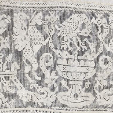 It’s interesting to note that the most detailed piece is the 17th century Cooper Hewit holding; and that iteratino is most like the 16th century darned net sample (two baby birds; pomegranates growing from the urn base; other similarities)/ The other pieces are closer to each other (one baby bird, downward growning side urn decorations, etc.). I note that the tendency fo these patterns is to lose rather than gain detail over time. But in the absence of any scholarly examination of these pieces, I can’t challenge the museum dates. But I can safely say that considerable leeway exists in pattern interpretation.