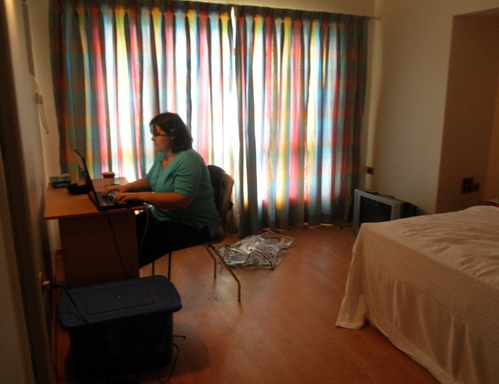 Elder daughter, doing what comes naturally.  Note my knitting and stitching stash bin in the foreground, and yet another landlord abandoned dead TV in the background. Our bedroom is the same, a bed, a wardrobe wall that includes both hanging space and shelves behind wood and mirrored doors, and a king size bed.  No student desk in ours, though.