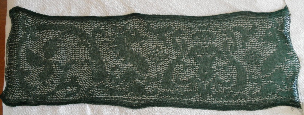The first shot above was taken with the stole patted out on my bed. It’s worth noting that it’s a king-size bed, and the stole as it is right now stretches almost entirely across. I don’t know how I’m going to block it here because I can’t pin it to the marble floors. I might have to wait until we get a rug, provided of course, the rug is large enough.