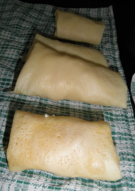 Spread out one clean kitchen towel in a safe spot near the stove. Pour a VERY SMALL quantity of oil into your omelet pan, wiping most of it out with the paper towel. Reserve the towel because you’ll use it again between crepes. Set the pan to heat. When the pan is hot, take it off the heat and ladle just enough batter into it that when the pan is swirled, the bottom is covered. Set the pan back on the flame. The edges of the crepe will release from the side of the pan and curl in, and the top of the crepe will eventually look dry and less shiny. When that has happened, take the pan over to the towel and inverting the pan and rapping it on the towel, turn out the cooked crepe. If it landed folded, spread it out to cool, with the cooked side up. Wipe the pan with the oily paper towel.