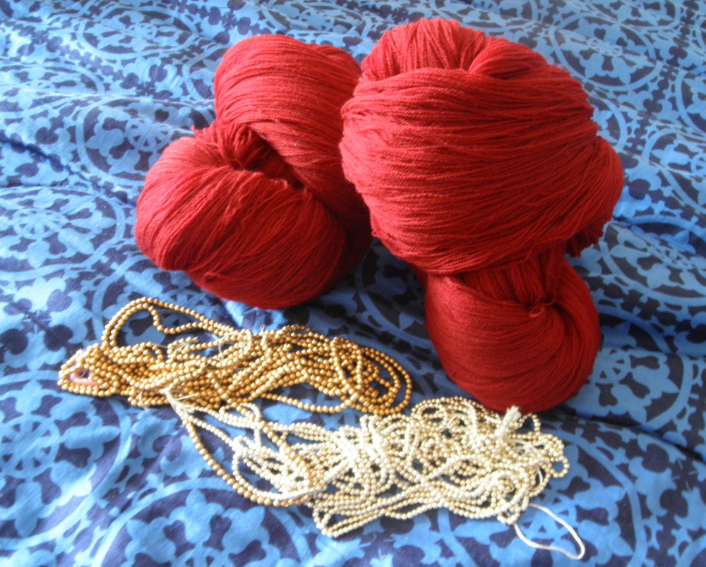 I came away with some crimson laceweight. It’s about a 2/20 weight and in all probability, either all acrylic or an acrylic/nylon blend. I’ve got roughly 400 grams (about 14 ounces), so I’d estimate that I have in the neighborhood of 4,500 yards. I also got two fistfuls of small metallic beads, one silver tone, and one antique gold. The princely haul below set me back about 600 rupees, roughly $11 US.