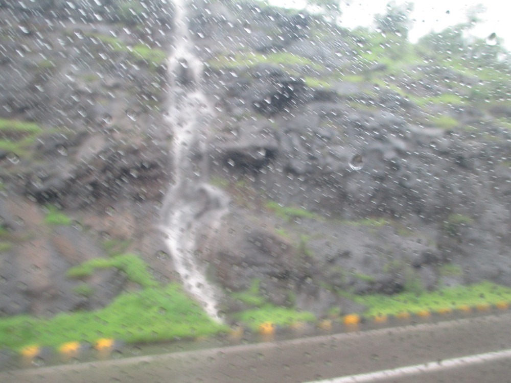 First, on the car trip from Mumbai to Pune, inland and up the ridge that marks the edge of the Deccan Plateau (Pune is at about 1800 feet above sea level), the dry and scrubby hills were transformed. Where before there was dust, some sprigs of tenacious, prickly looking shrubs and cacti, are now pillows of lush vegetation and soft grasses. Rocky ledges are now waterfalls, with greater and lesser cascades threading down the slopes, joining to make fast-moving creeks. Dry stream beds that were little more than stagnant puddles and sand shoals are now broad brown rivers, filling their channels bank to bank, and running fast enough to make rapids. We saw newly sprouted fields, and families out planting rice in flooded paddies in village areas. In the cities I saw older people tending the vegetable patches and potted plants which have appeared everywhere a scrap of space can be found. Unfortunately, all of our attempts to take photos showing the waterfalls and green fields were unsuccessful. Here’s the best of the lot: