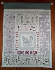 In addition to Amy Schilling’s Dalek (chart at link above), I am using several alphabets from Ramzi’s collection of vintage Sajou and Alexandre leaflets, available at his Free Easy Cross and Pattern Maker website – a fantastic resource that should be better known.  You’ll note that for once I’ve actually laid out the motto ahead of time, rather than trust to luck and eyeballing.  This is because Younger Daughter is a creature of logic and symmetry.  I accommodate her preferences with a bit more precision than I usually use.