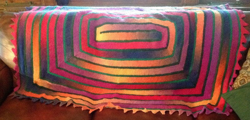 I like the way the mitering worked, even on the very narrow green strips.  I also used a sawtooth with a ten-row repeat, so I was able to easily fit it around corners, letting the natural splits between the teeth accommodate the direction change.  Swirly now goes to Elder Daughter, to replace the last blanket I knit for her, back when she was born.