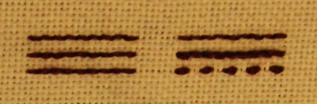 Both a bit of heresy, and a chimera of sorts, Wandering Running Stitch neither plain Double Running, nor is it true Back Stitch.  Advantages are that it looks like Double Running on the public side of the work; uses the same amount of thread as Double Running; and avoids now-how-do-I-go-back problem.  It’s main disadvantage is that like Back Stitch, the reverse side looks different from the front.  In this case, the reverse shows a discontinuous, dashed line of double-thickness. The overall effect is a bit heavier on the reverse than is plain Double Running, but is not as massive as Back Stitch.