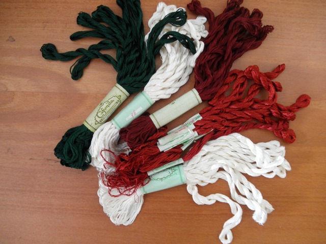 The websites that offer this thread vary a bit in description. Some say it is a 35% silk/65% rayon blend. Others say it is all rayon. Contemporary put-ups specify 8 meter skeins. My vintage stash skeins are a bit longer, possibly 10 meters (I’ll measure tonight). The large bundles above are actually “super-packages” of ten individual skeins. You can see the bright red one at the left is broken open, with the single skein labels showing. On mine, color numbers are written on each skein by hand, not printed. There can be hue variances between the super-packages of the same color number, so I suspect that special care should be taken to buy all that’s needed at once, so that all is from the same dye lot.