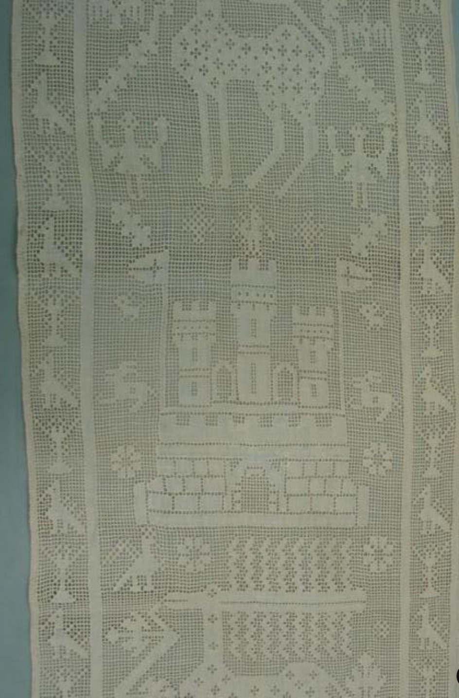 Found another. This one is in the collection of the Rhode Island School of Design (RISD). Accession number 56.043.12 in case this link breaks. They log it as being an Italian furniture runner from the 1800s. Not sure what to make of that, but I do note that the composition of the piece as a whole plus the design of both the castle and accompanying birds are spot on congruent with the ones above.