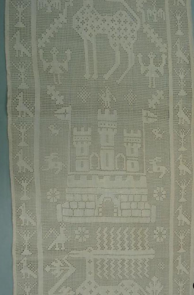 There were small fragments of partial designs underneath the castle in T-8045 that associated it with this this other Hermitage artifact (T-8043). This one shows a boat with passengers, several happy fish, and a pair of rather blocky lions. The photo below is credited to their official artifact page for T-8043, where it is attributed to Italy, from the late 16th-17th century. They call it “Embroidery over drawn thread”.
