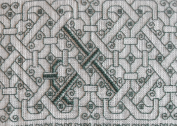 No new stitches to speak of in this one but I did use long armed cross stitch on the panel at the very bottom, the oak leaf and acorn bit, and in the spot fillings for the “beads” in the wide meander just below the lion/dragon beastie. The texture it produces when massed has a very plaited appearance compared to plain old cross stitch.
