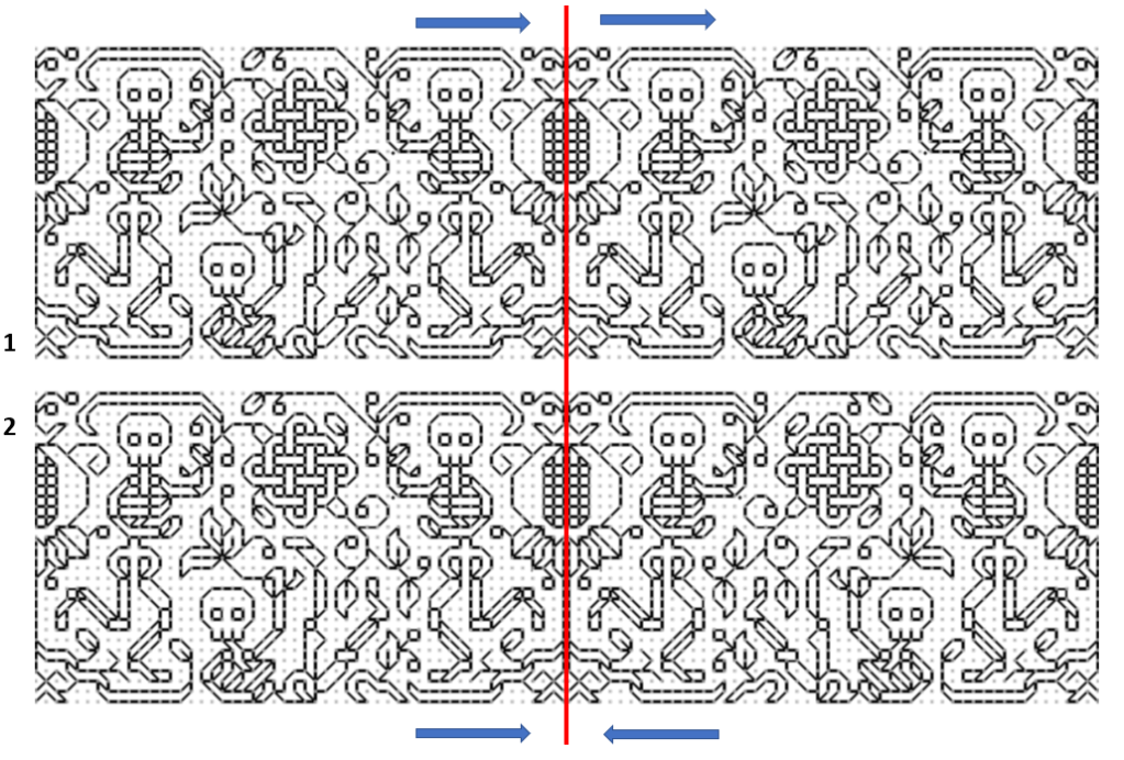 The repeat on my Dance strip and corner is a bit unusual, and seems to be causing far more problems for stitchers than I anticipated. I designed it so it could be used both as a straight repeat and as a mirrored repeat, but that appears to be the source of the confusion. I’ve talked about the types of repeats and symmetries before, but I will recap briefly.