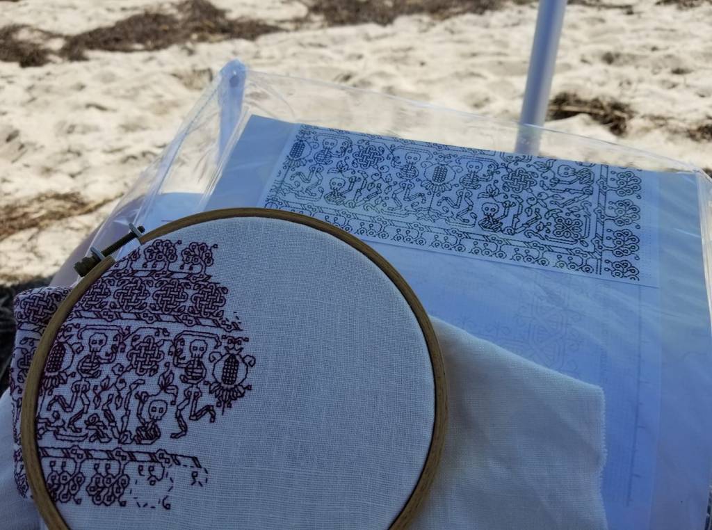 You CAN stitch outdoors in high winds. Hand held hoops work better than flat frames that can act as a sail when it really starts blowing. One of those zippered clear plastic cases that new sheets and blankets come in helps, especially if it has an inside pocket where the product info used to be. That works great for keeping a chart clean, dry, and away from the wind; and the zippered part is great for containing your threads and other essentials away from sunscreen and salt spray, (and holding the project between working sessions, too). You can even use two magnets to keep place on the chart without removing it from the pocket. Tethering your snips with a retractable badge holder works nicely. But at the beach on on very humid days, watch out for the damp! Some threads may crock or leech dye.