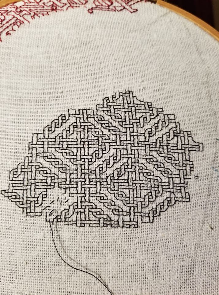 And mixing thicknesses? It’s a great tool. Jack Robinson – the UK’s Blackwork Patron Saint (now of blessed memory) – was a strong advocate for both historical and modern pieces that mixed thread thicknesses.