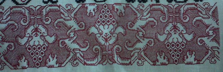 By contrast with these two balanced examples, there’s the piece I am working on right now. I am working the black bit with one strand of standard DMC 6-ply cotton floss. It’s about 14 stitches per inch (28 threads per inch).