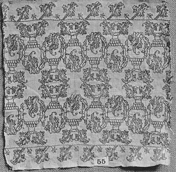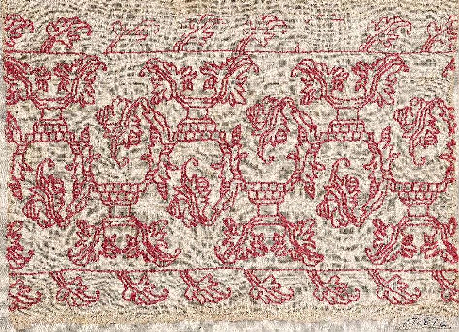 And third, which I only stumbled upon today. This one appears to be a photo only recently released by the Victoria and Albert Museum, Accession 645-1896. Be still my heart, it shows the design on fragments that were pieced into a wearable apron, providing a use case beyond what can be known from a simple fragment. The V&A also notes that the apron was composed from previously stitched fragments. They label the assembled wearable as 1630-1660, Italian, but it’s unknown what life the embroidered strips had before that usage. Best of all, among their images is one that shows the back. Yup. Double running stitch. And yes, I know they see vases in the composition, but my mind is stuck on describing the center bits as bricks.