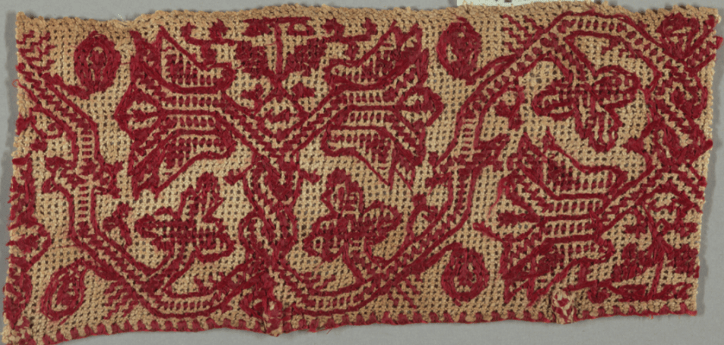 Just for fun, here are some more examples so you can see the breadth of expression of this stitching family. There is a lot of variety in works done on buratto. Monochrome was common. Polychrome was common. Dyed grounds were common. Geometrics and florals were both common. Also the style went through several revivals, and was particularly prized during the “Indiana Jones” era of textile collecting. Many museums collections are based around those gleanings, and haven’t been revisited since their donation before WWI. As a result, many attributions are a bit “mushy” – there are certainly revival pieces marked as pre-1700s originals, and even the real experts (of which I am not one) have problems determining age without extensive forensic testing.
