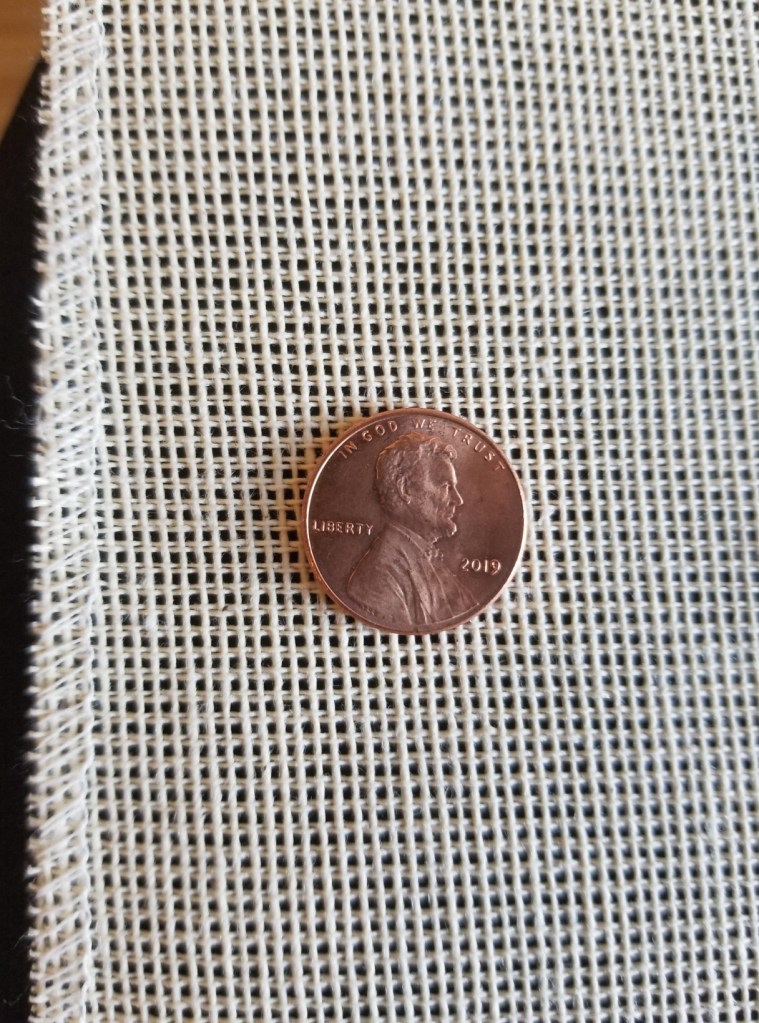 All well and good. I do steam things on occasion and it might come in handy. But what caught my eye was the weave. I think it’s sideways in my penny photo, but note the doubled thread in one direction (probably the weft). That’s not unlike the woven ground used for Buratto embroidery – a stitched and darned form popular in the 16th and 17th centuries, stretching on to the 18th century. It’s a cousin to other better known darned mesh works done on knotted netting grounds or on withdrawn thread scaffoldings, but in Buratto’s case the ground was purpose woven as a mesh.
