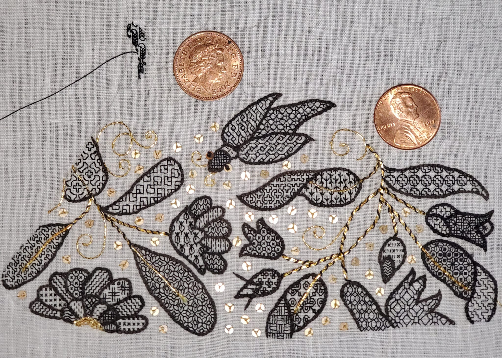 On lack of advance planning and charting – In general on an inhabited blackwork project (the type with outlined shapes and fills), I do very little planning ahead. Each flower or other motif is considered when I get to it, I pause, look at the new bit, decide if I want a dense/dark fill or something lighter; consider contrasts for any sub-components; and try to balance the types of fills used. Do I want the turned underside of a leaf to contrast with the rest of it? Should I put two fills that are angular and spiky next to each other, or should I try to maximize texture contrast in addition to density? Is the current space big enough to give play to one of the larger, more complex fills, or is it so small that a simple one would work better there; or should I abstract the “main motif” of a more complex fill to complete that space? Is a particular fill so stand-out that it will influence the choice of those around it? On that last one, the bead-like fill in the leaf just under the US penny is so striking that I would not want to use another rondel-based design nearby.
