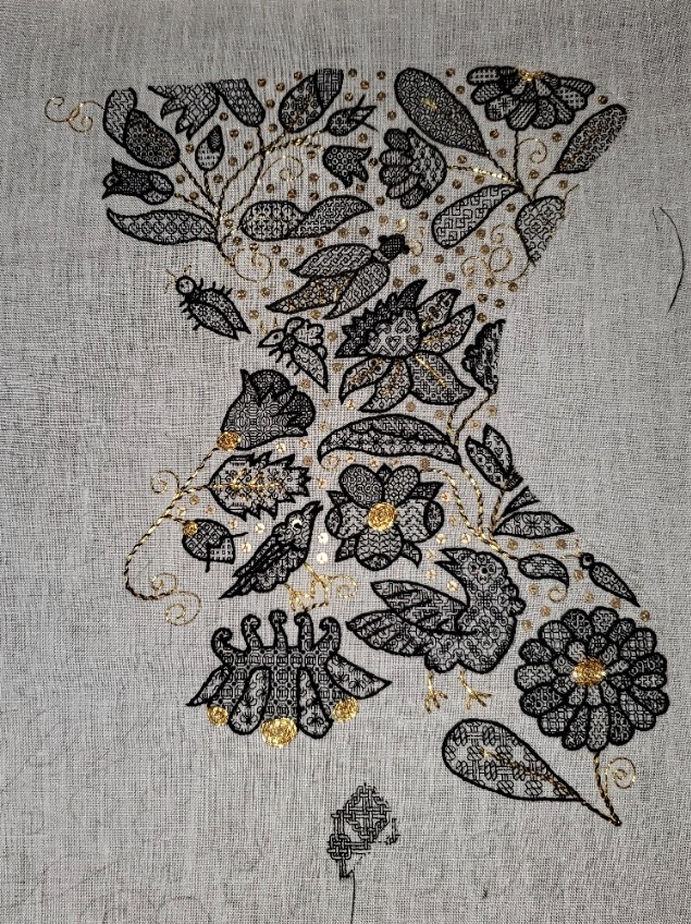 A second, larger bird has joined the first, along with the multi-petal flower with its leaf, the rather odd looking columbine (the bit with the three gold petal ends) and some of the foliage, curls, and spangles that surround them. I’m now working on the first of two large grape leaves below the columbine. This area features some larger shapes to fill and I am having lots of fun with them by using some larger, more complex fills. The interlace currently being worked in the grape leaf looks complicated, but once the rhythm of the thing is started, it’s really quite logical.