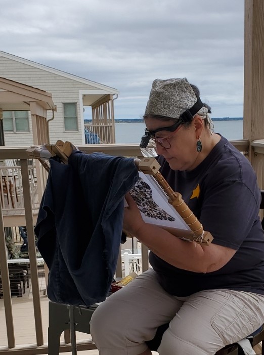 Obviously I am determined to make that completion deadline. I’ve been trying to stitch at least four hours per day, sometimes more if I can. Although we absconded to our place on Cape Cod for a long weekend, and I took my stitching with me. And there I had a grand time sitting out on our deck, working away in shaded sunshine and light airy breeze. Not too hot, and not too windy. (Thanks to the Resident Male for these live action photos).