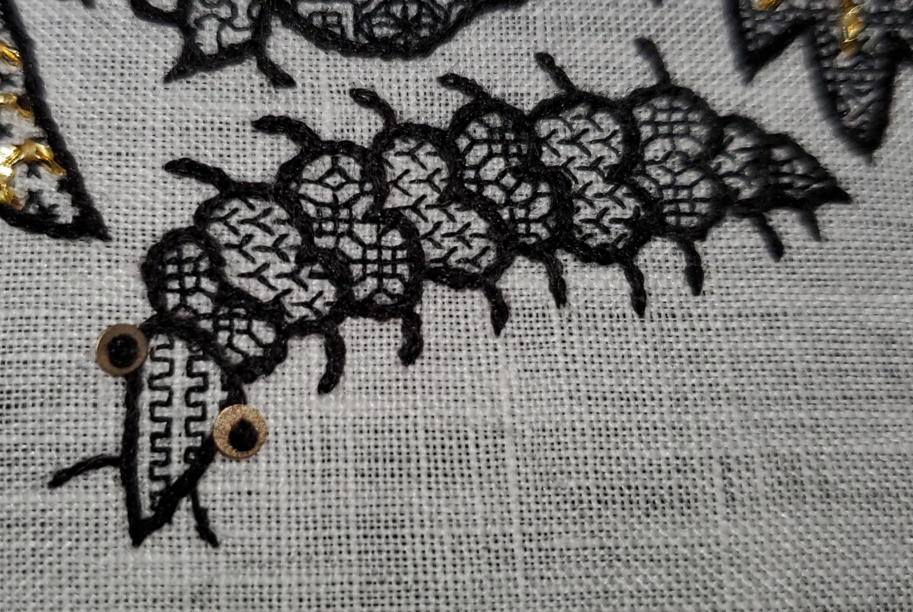 I finish up with a detail shot of the creeping caterpillar. He’s my favorite insect on the piece, but he was surprisingly tough to do. There isn’t a lot of real estate in those heart-shaped body segments. I tried to find fill patterns that would contrast nicely both in tone and “spikey-ness”, and still be somewhat distinguishable in those tiny areas. I ended up using three – one for the face, and two alternating, for the rest of the body. The eyes are always fun. Where possible I’ve been using the same 2mm paillettes that spangle the ground for eyes, held on with French knots. Do you feel seen?