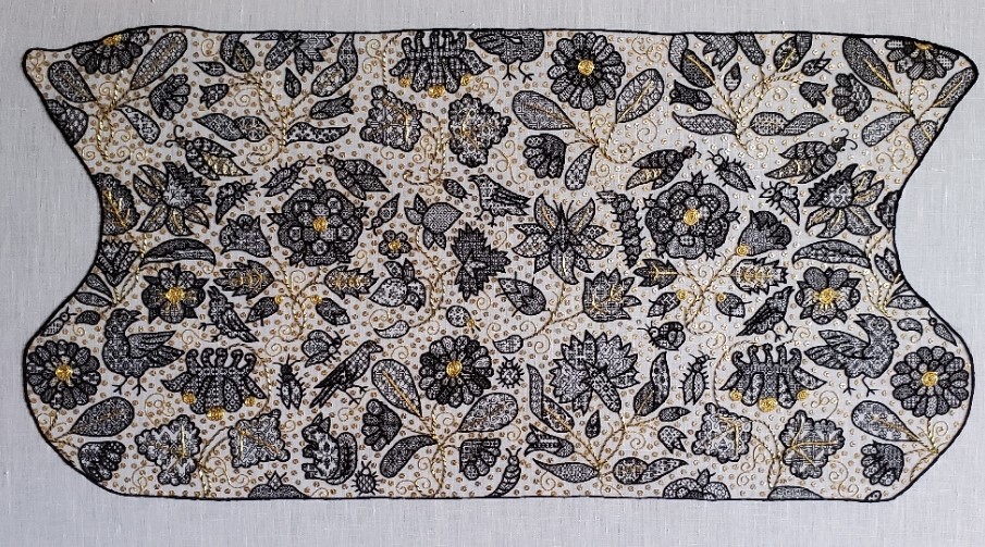 Why a jam? Because early on in this project I declared that I would not be repeating fills between motifs. A flower could have multiple petals in the same pattern, or a bug might have matching wings in a single pattern, but once that pattern hit the cloth and the motif was completed, it was “burned” and not used again on the rest of the piece. That made some anxious moments because there are A LOT of shapes to fill, especially small jelly bean sized ones. More than once I made an inadvertent duplication and rather than ripping out the work, had to mod the second showing so it would be distinct. Or I had to fill a particularly challenging tiny spot, and just winged it because nothing I had would show well there.
