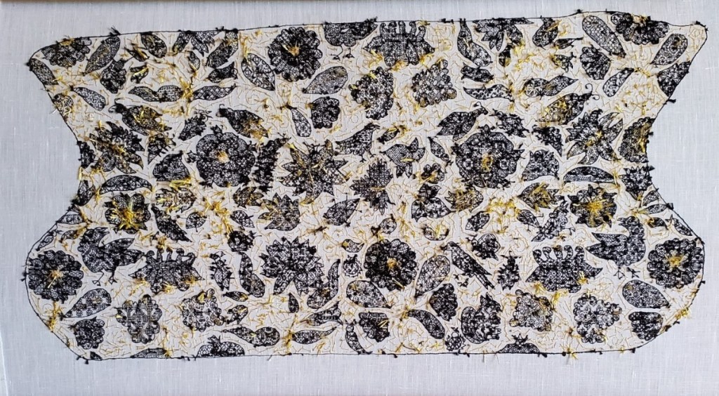 For shipping, I don’t want to fold or roll. All that metal thread is a complication. I will lay it flat and wrap it in the tattered cotton pillowcases I have been using as backlight-drapes on the frame. Then I will package that in bubble wrap plastic, making sure that the wrap is sealed against moisture. I will cut pieces of sturdy cardboard larger than the plastic wrapped bundle, slip a paper with shipping and return info on top, and sandwich both between those pieces. Heavy packing tape to seal the edges. I may go one step further and then use brown paper to wrap the whole package, marking it with Fragile, Top Stack Only, Do Not Bend, and the required shipping and customs labels.