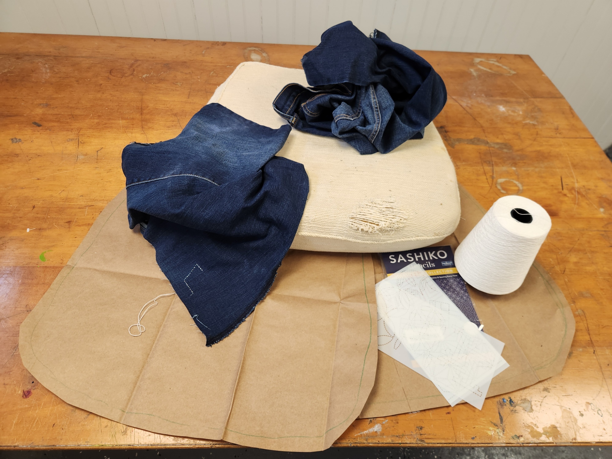 Been there. Done that. My advice is instead of sewing on paper, use a light weight linen to stitch the denim on. Check your local outdoor store. I found sale cushions on clearance that I was able to cannibalize, much cheaper than buying foam. As to the sashiko, I had to hoop it. The needles dull quickly.