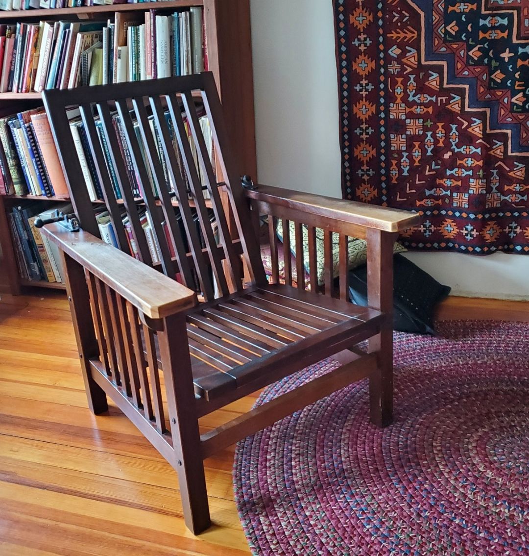 The office is the room with the hanging tambour carpet, and is largely furnished in mismatched Trash Panda style – a couple of purpose-purchases like my standing desk and an OttLight, plus items reclaimed from local everything-free groups, curbside abandonment, and opportunity shops/consignment/resale stores.  These include two low end Arts & Crafts style cabinet bookcases, a barrel chair I’ve been hauling around with me since 1978, and the most recent addition, a reproduction Arts & Crafts reclining chair.