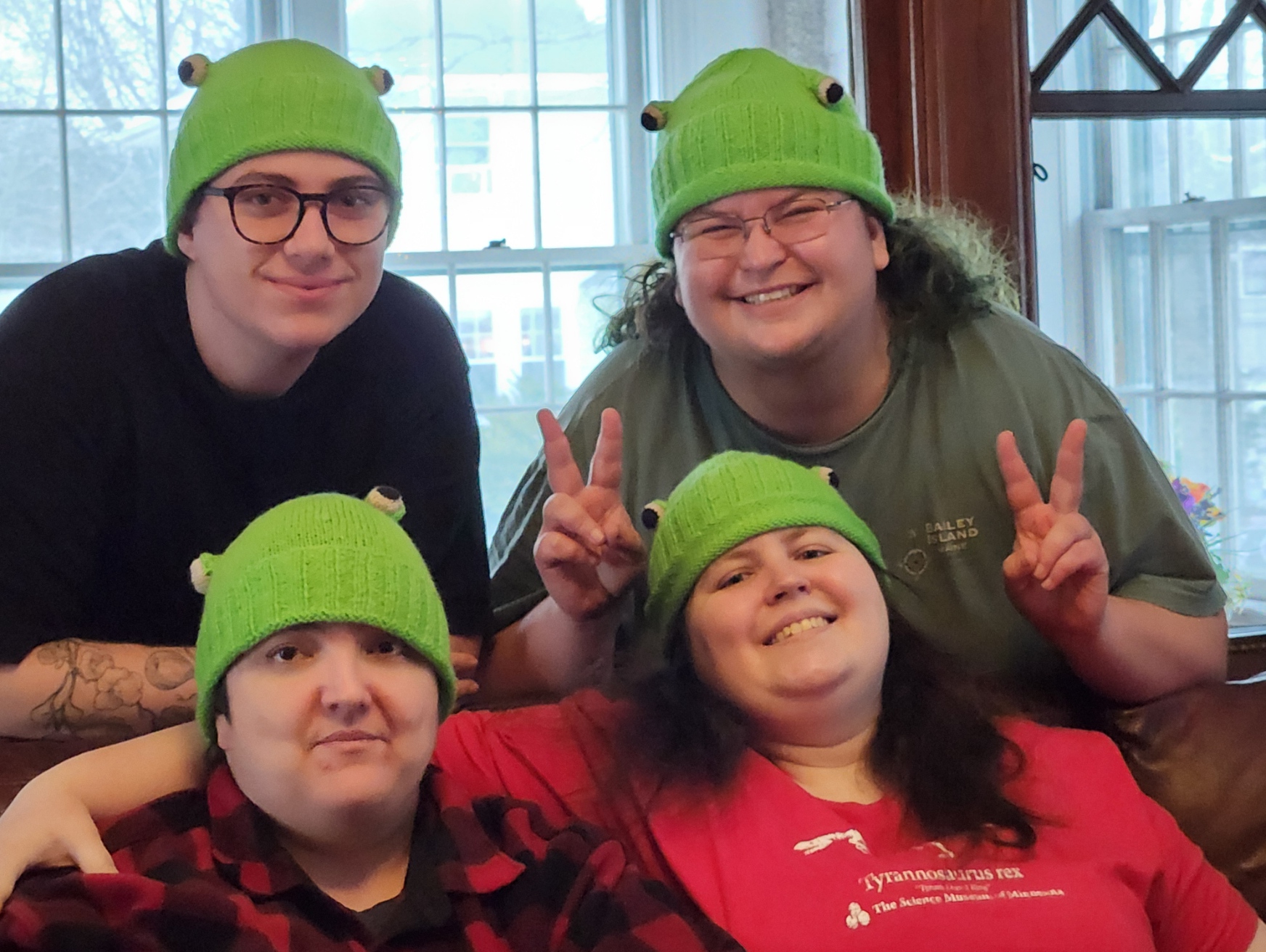The other big project was my set of frog hats. Five of them have been given to the recipients, all received with delight and enthusiasm. Four shown below, on consenting adults.