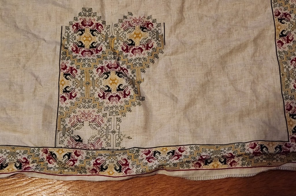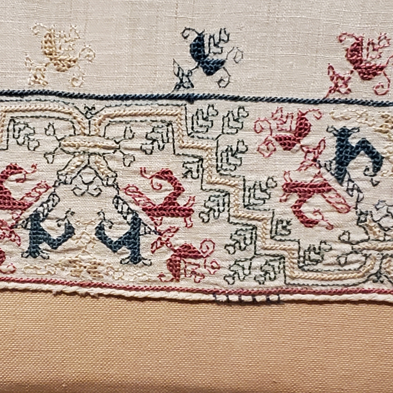 And after all this stitching is complete I will do a close-rolled hem, like the original. Possibly with the vertical ornamental elements in green also shown in the photo above. I haven’t decided on whether those are plain vertical stitches, buttonhole, or blanket stitches – the fragments are few and difficult to interpret from the museum photos and the ones I took at the 2023 MFA exhibit. In any case they are clearly decorative and not structural because there are very few hits of them scattered around the edges, and the hem is sewn and intact even where they are absent. The last step will be cheeky little red tassels on the corners.