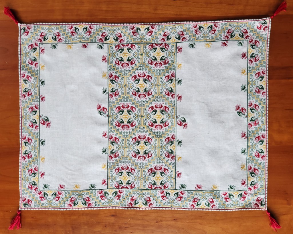 Final finished dimensions (not counting the tassels), are 60 cm wide x 45 cm tall (about 23.6 inches wide by 17.7 inches tall). It’s stitched using one thread of standard DMC cotton floss on 40 count linen. The stitches used are double running, Montenegrin, and two-sided Italian cross stitch. Although the thing is mostly double-sided, I did not take any special measures to hide ends.
