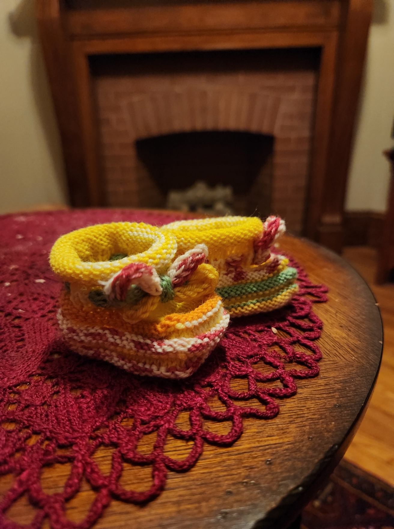 I had a special request to knit some booties for a the sister of a friend of a family member – the first of that particular friend circle to have a baby. My favorite bootie pattern is a quick knit. I can do a pair in about four hours, so why not.