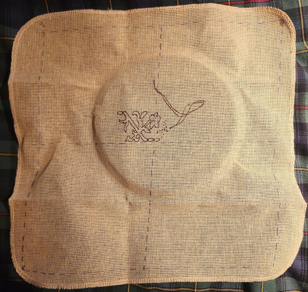 What you see here so far is simple uncounted basting in blue, marking out margins and centers. Those skew cut edges and the amount of area wasted does annoy me a bit, but this piece of cloth was never intended for the purpose to which I am putting it. Just above the center line you can see my start – double running in crimson faux silk (rayon). The design is already 100% established and from this point I can go left and right “off book” just by copying what I’ve already laid down. And I will have T2CM with me, electronically, just in case.