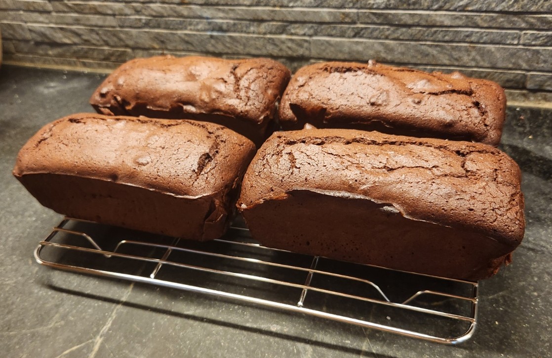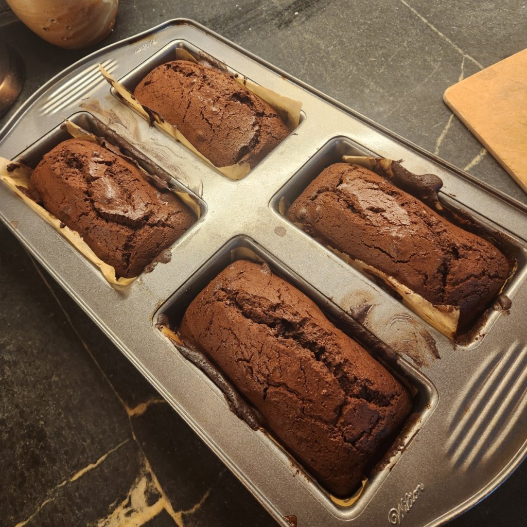 Fourth, I omitted the chocolate ganache glaze entirely. I knew I would be freezing the three extra cakes, and I know from experience that ganache can get chalky when that happens. Given that the four little loafs were moist and tender, and we would be eating one right away, I didn’t see the need. I can always whip up a little bit of glaze when we defrost a survivor if I think the extra moisture is needed.