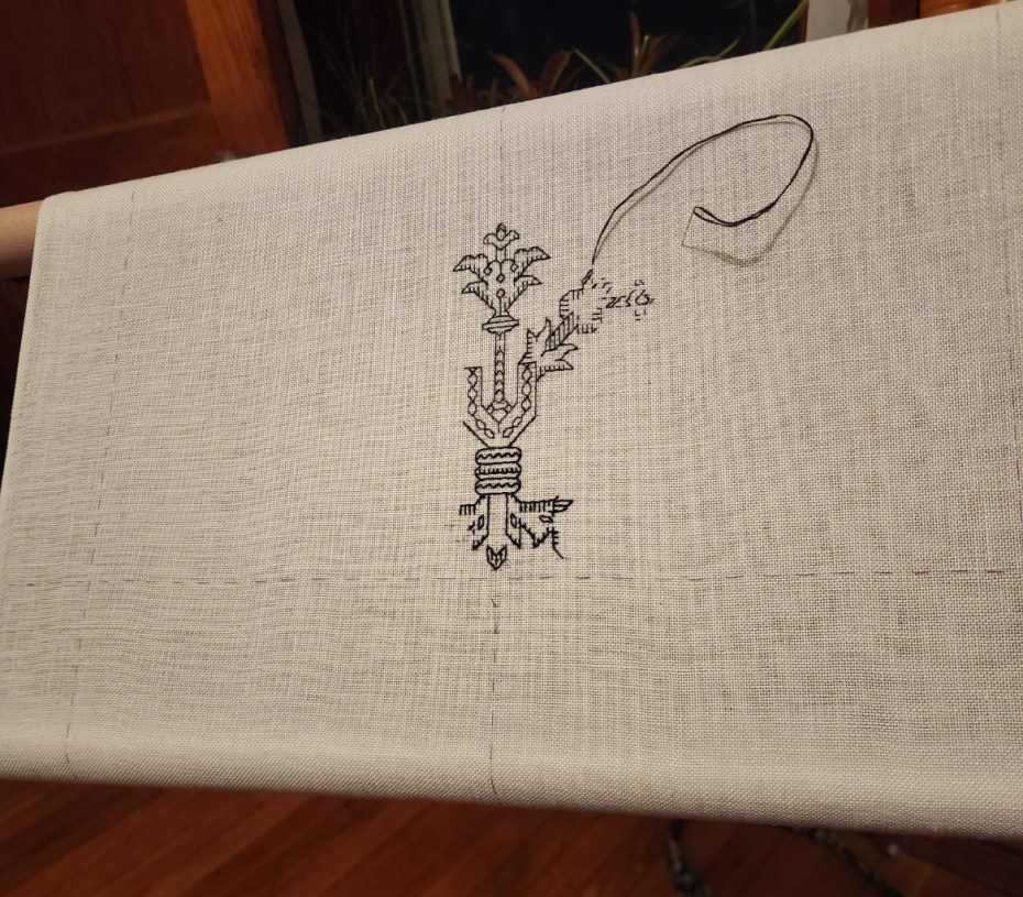 Thank goodness for a deep stash. I vastly prefer stitching on finer count linens, and consider 40 to 70 threads per inch to be my sweet spot. But that doesn’t mean I don’t have linen of other counts squirreled away. I have unearthed a lovely piece of 28 count. Big as houses. Very easy to see. So I grabbed it, cut a healthy piece, hemmed the edges, basted my edge and center guidelines, and mounted it on my largest width Millennium scrolling frame.