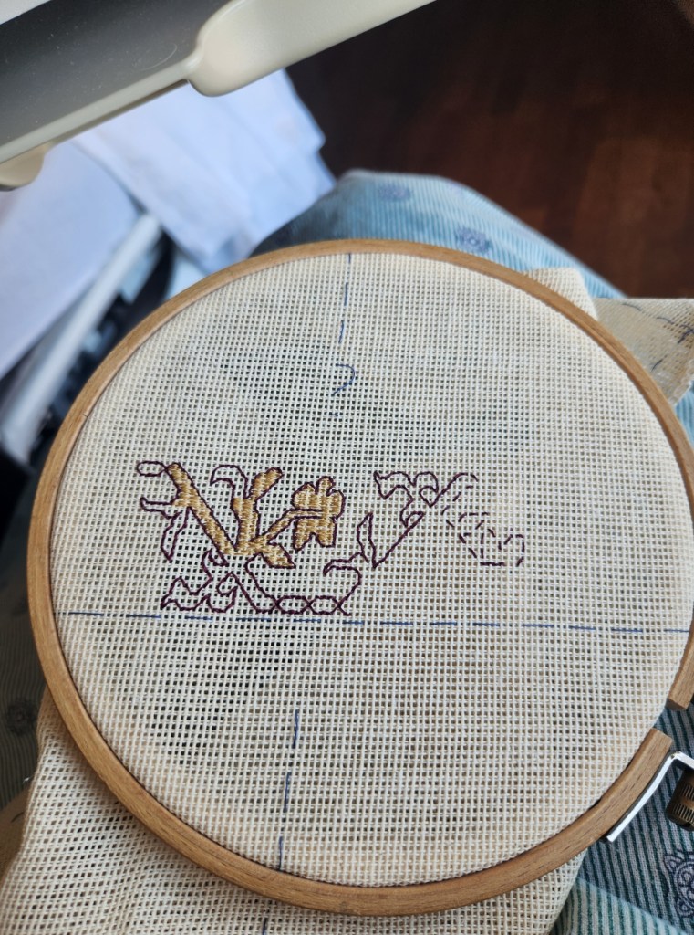 I am not pleased with it. I’m using some of the leftover Ciafonda faux silk I got in India. Nice enough thread, but not lofty enough for this. Even stacked, the double running stitch fill is too sparse. I supposed I could pick it all out and begin again, but right now I don’t have the patience to do that. I’m going to set this small wash-cloth size bit aside and get back to it later.