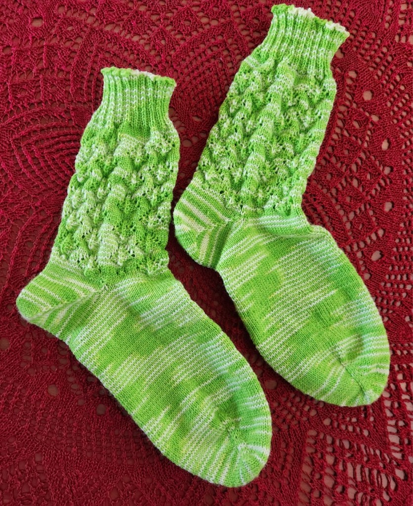 As you can tell from the bit of hospital tray shown, I had been working on this during my stay there. But I also brought knitting with me, and bargained with the various specialists installing the needed lines and monitors to leave my “bendy parts” clear, including inner elbows, wrists, backs of hands, and index finger tips. They were kind enough to work around all that. As a result, here’s last week’s finish. Yet another pair of socks cast on in pre-op, and finished during the ensuing week and a half of recuperation.