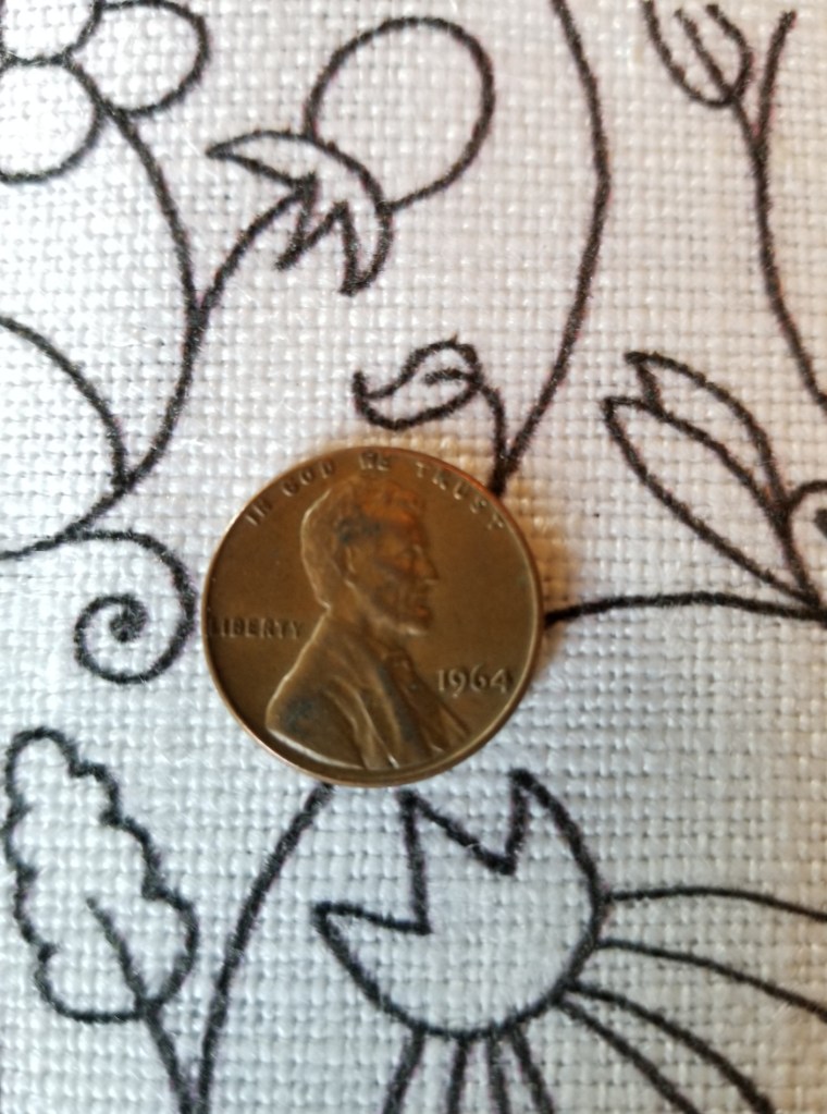 Note that the cotton canvas (left) isn’t really countable, but it has a dense weave structure that might be amenable to surface work. However I am not a textile history expert, and I don’t know if fabric of that structure, even if it were not cotton would be appropriate to the period of the design. The linen however is plain tabby weave. By counting threads occluded by the penny I get 17 horizontal threads x 21 vertical threads. Factoring in the penny’s standard width of 0.75 inch, we can compute a thread count of approximately 21 x 26 threads, but I can’t tell which is warp and which is weft due to the lack of selvedges. Skew but easily counted and stitched.