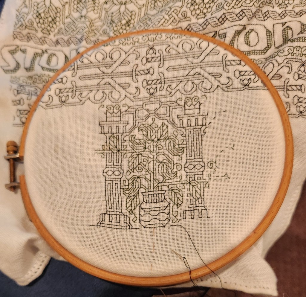 And the last bit that didn’t work as well as I hoped is the use of the two colors in this strip. Stone by Stone is stitched in black and green. A very deep green. It alternates by strip except for the motto, in which the foreground of the letters is worked in black, while the shadowing is done in green. The vegetable bits and tendrils of this band are all in green. The columns, arches, and urns are in black. I’m hoping that the green leaves in front of the black columns won’t be so confusing looking when more of them have been completed.