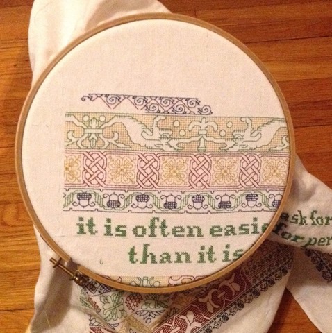 2. The alphabet for the main quote is from Sajou #55, posted by pattern archivist Ramzi at his Free Easy Cross, Pattern Maker, PC Stitch Charts and Free Historic Old Pattern Books blog site. Thanks, Ramzi! I played with it a bit, working the curlicues in red and weaving them over/under the letter forms.