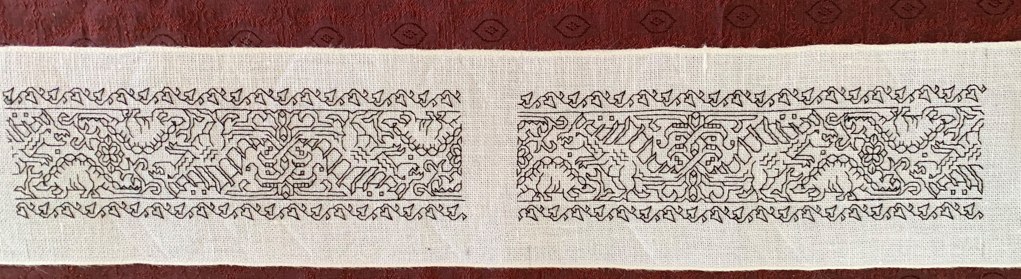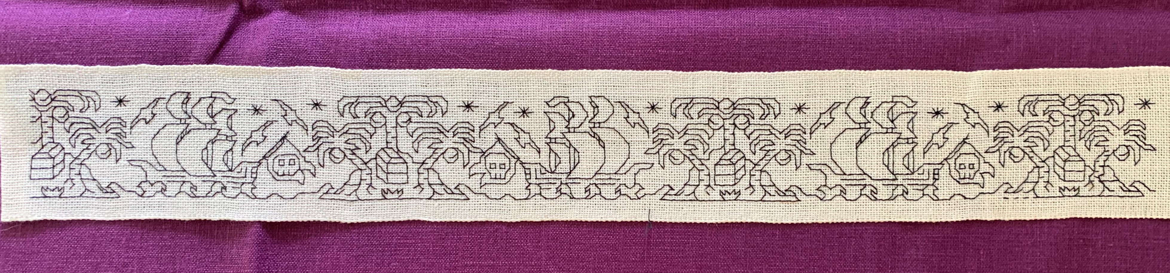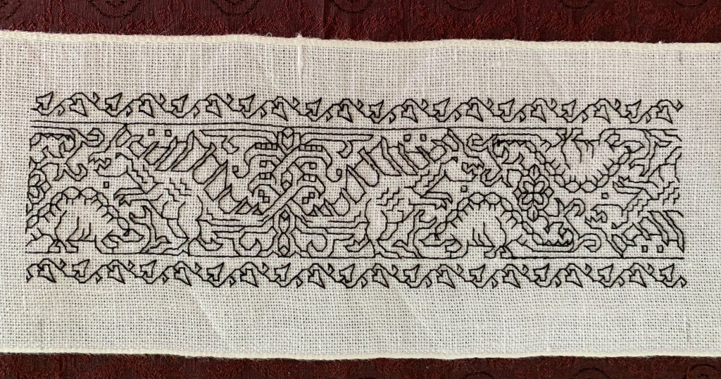 I do have to report an oops. One that dates back to the publication of The New Carolingian Modelbook in 1995. I hadn’t stitched the current strip before, mostly for reasons of size. It’s quite tall. But this being a very long piece of cloth, I thought it would work well on this piece. Lo and behold. There is a small crossings error in the original. It’s small enough to be an easy fix, but I will put redoing that page in queue and eventually publish it in here, and on the errata section on the “My Books” tab elsewhere on this site.