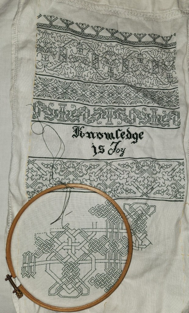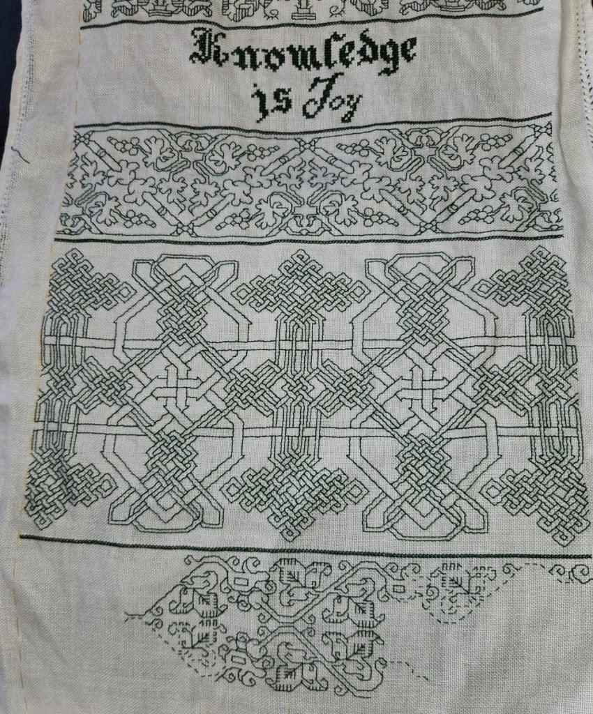 First, I’ve finished the wildly intricate interlace panel on my current sampler.