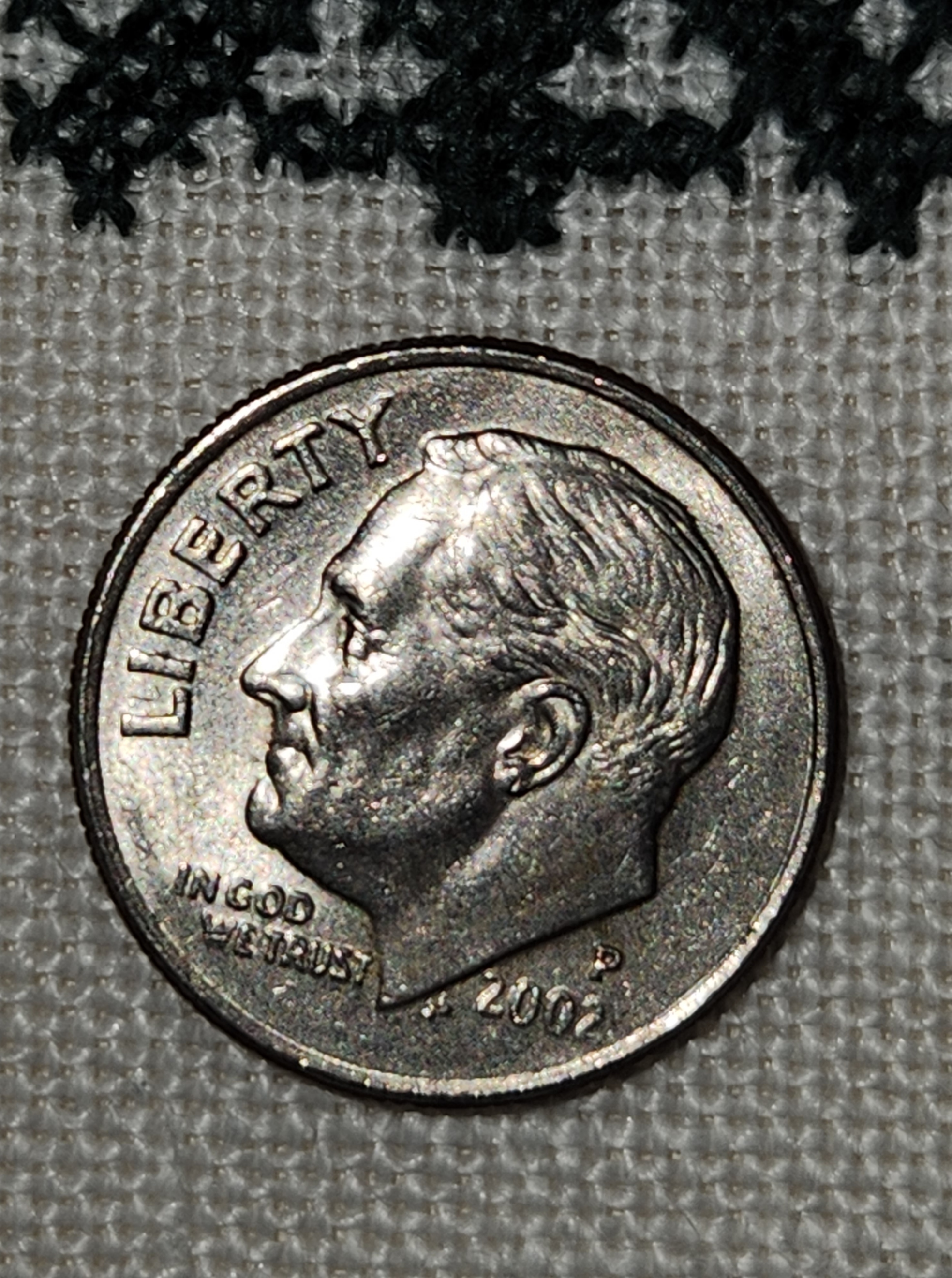 I picked the dime because it’s smaller than the nickel or quarter, and easier to count around the outside edge without losing your place. Counting the threads totally covered by the dime, heading north to south, we get a total of 26. And by counting the number of totally covered threads east to west, we also get 26. The first conclusion is a happy one. We have an evenweave.